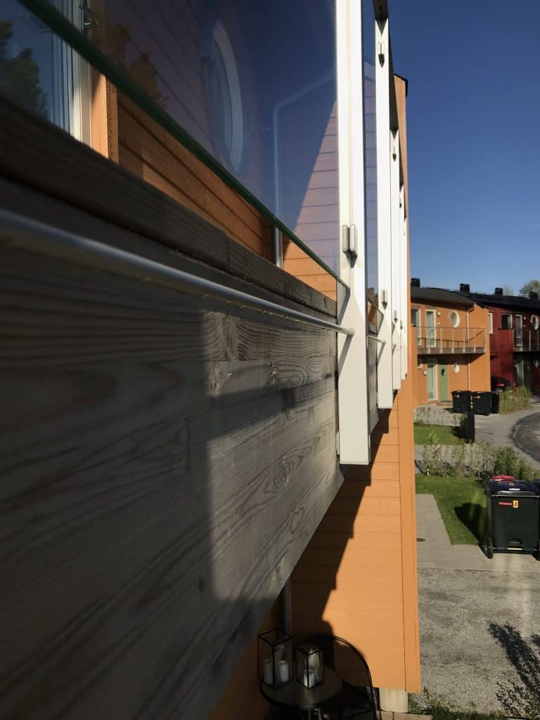 Möchten Sie einen besseren Windschutz für ein Holzgeländer haben, ist es oftmals möglich, vorhandene Andreaskreuze zu belassen und die Scheiben davor oder dahinter zu montieren.