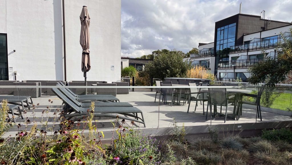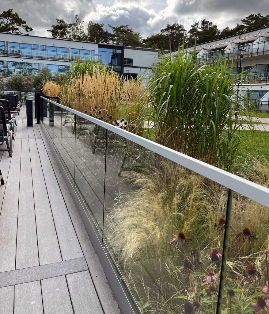 Wellness- und Konferenzanlage in die der Geländerladen ein Ganzglasgeländer im Außenbereich montiert hat.